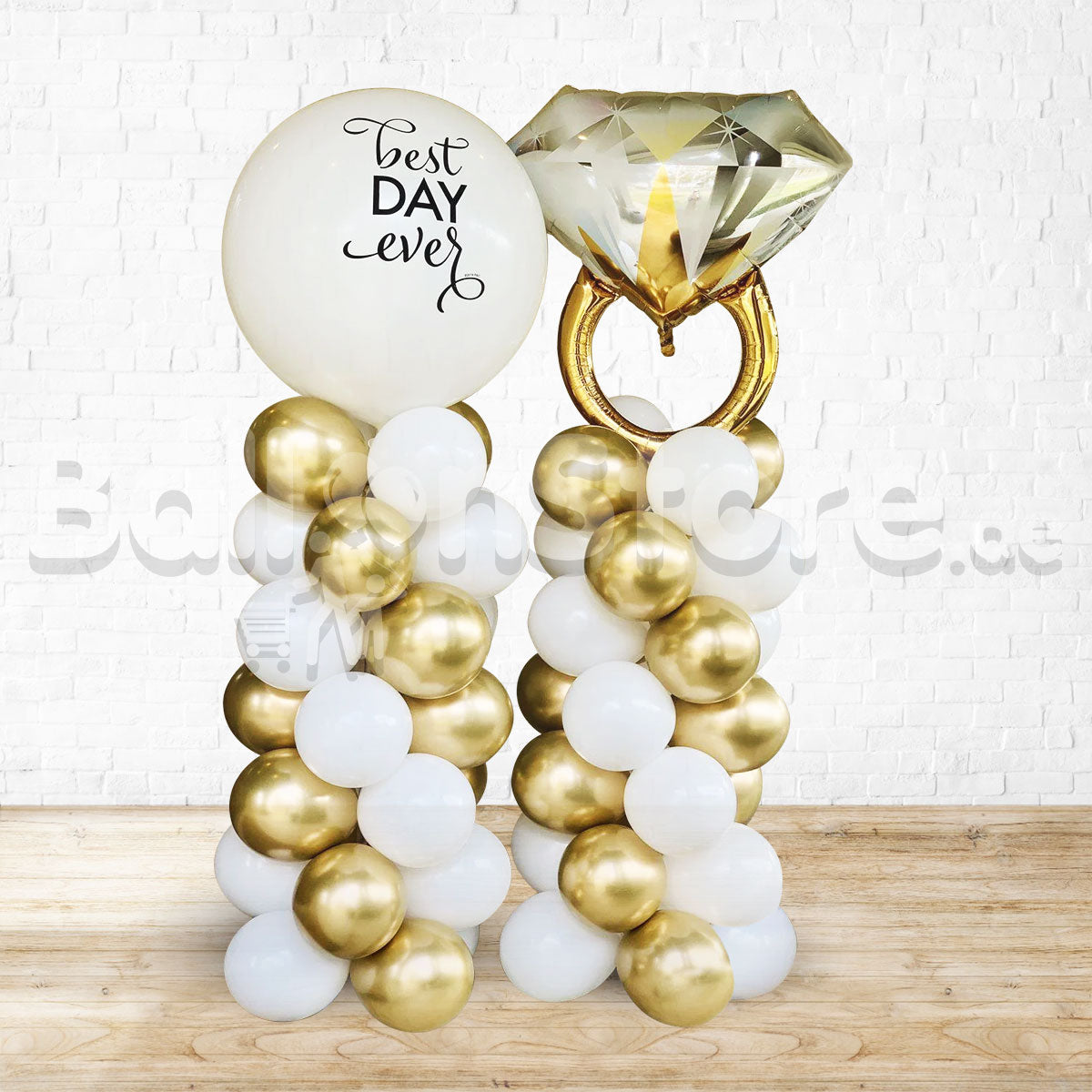 Helium-filled balloons in gold and white create a light and elegant atmosphere. Placing them at different heights around the venue adds depth and movement to the decor. Tying them with ribbons or arranging them in clusters makes the setup look even more stylish.